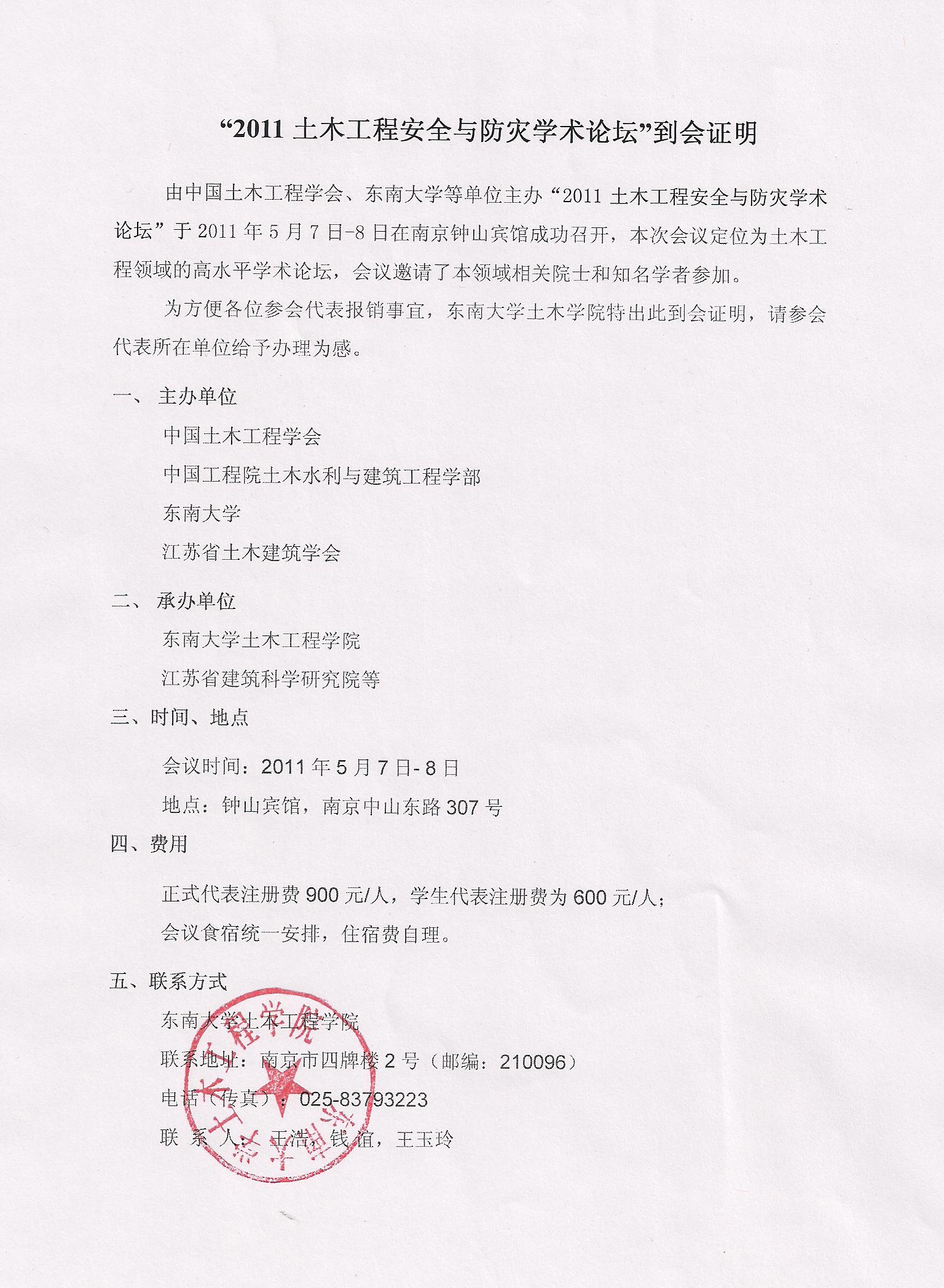 "2011土木工程安全与防灾学术论坛”到会证明