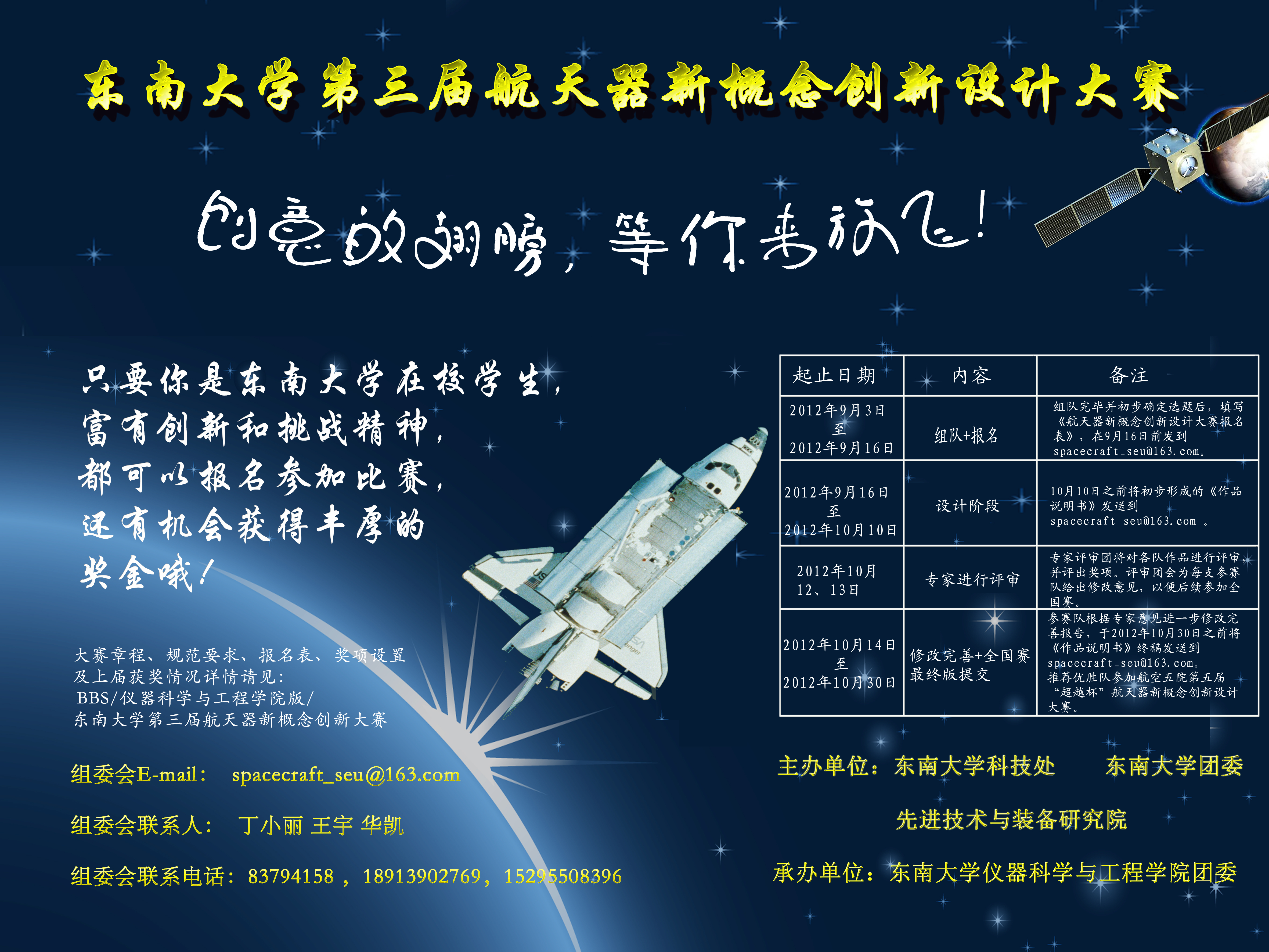 中国空间技术研究院总体部第五届“超越杯”航天器新概念创新设计大赛即将开始,为选拔优秀作品参加高水平的竞赛,现决定于2012年9、10月举行英国正版365官方网站第三届航天器新概念创新设计大赛。在之前两届的比赛中,英国365官网同学取得了丰厚的成果,连续两年获得此项比赛全国一等奖,并获得了多项二三等奖。